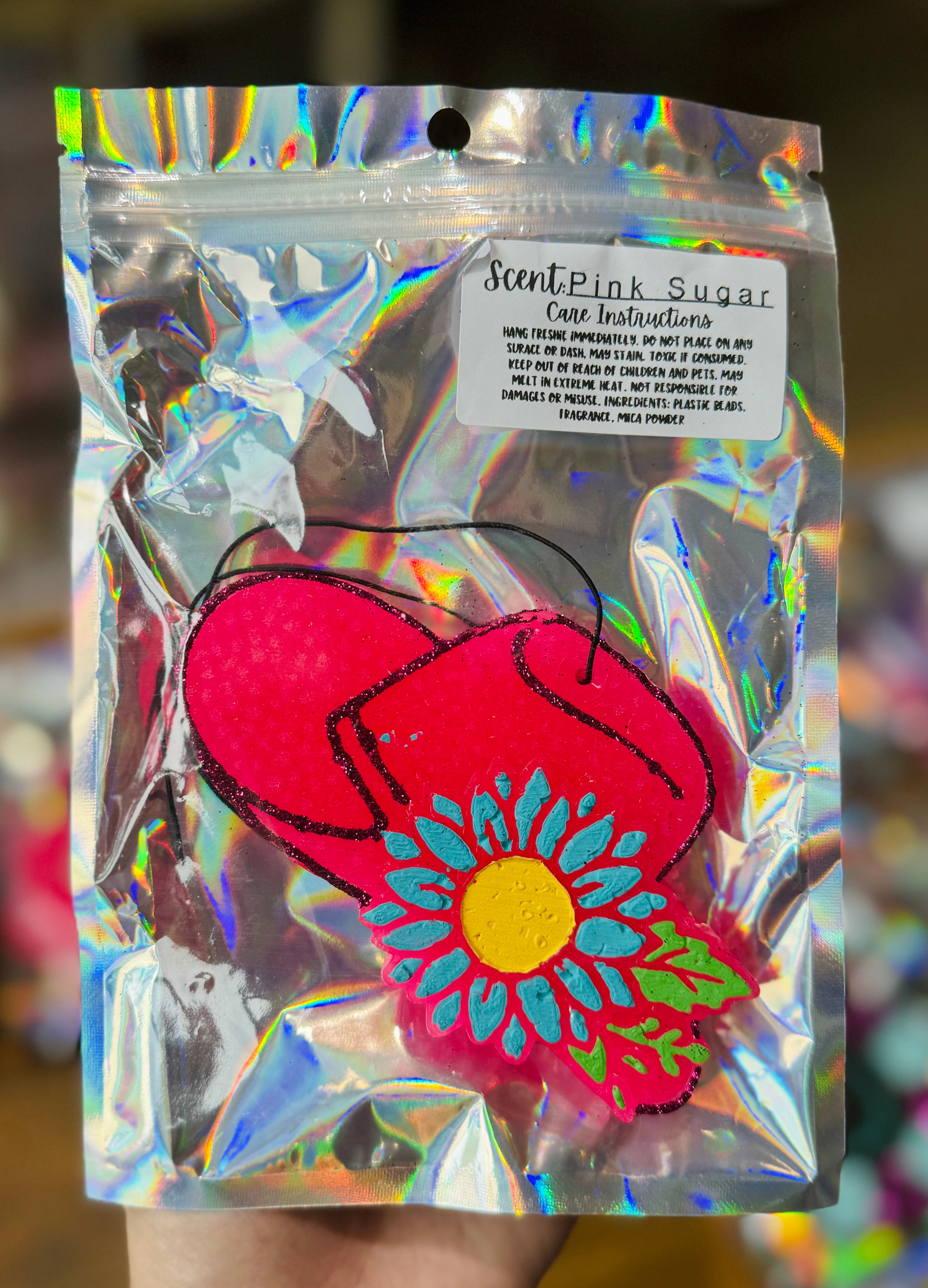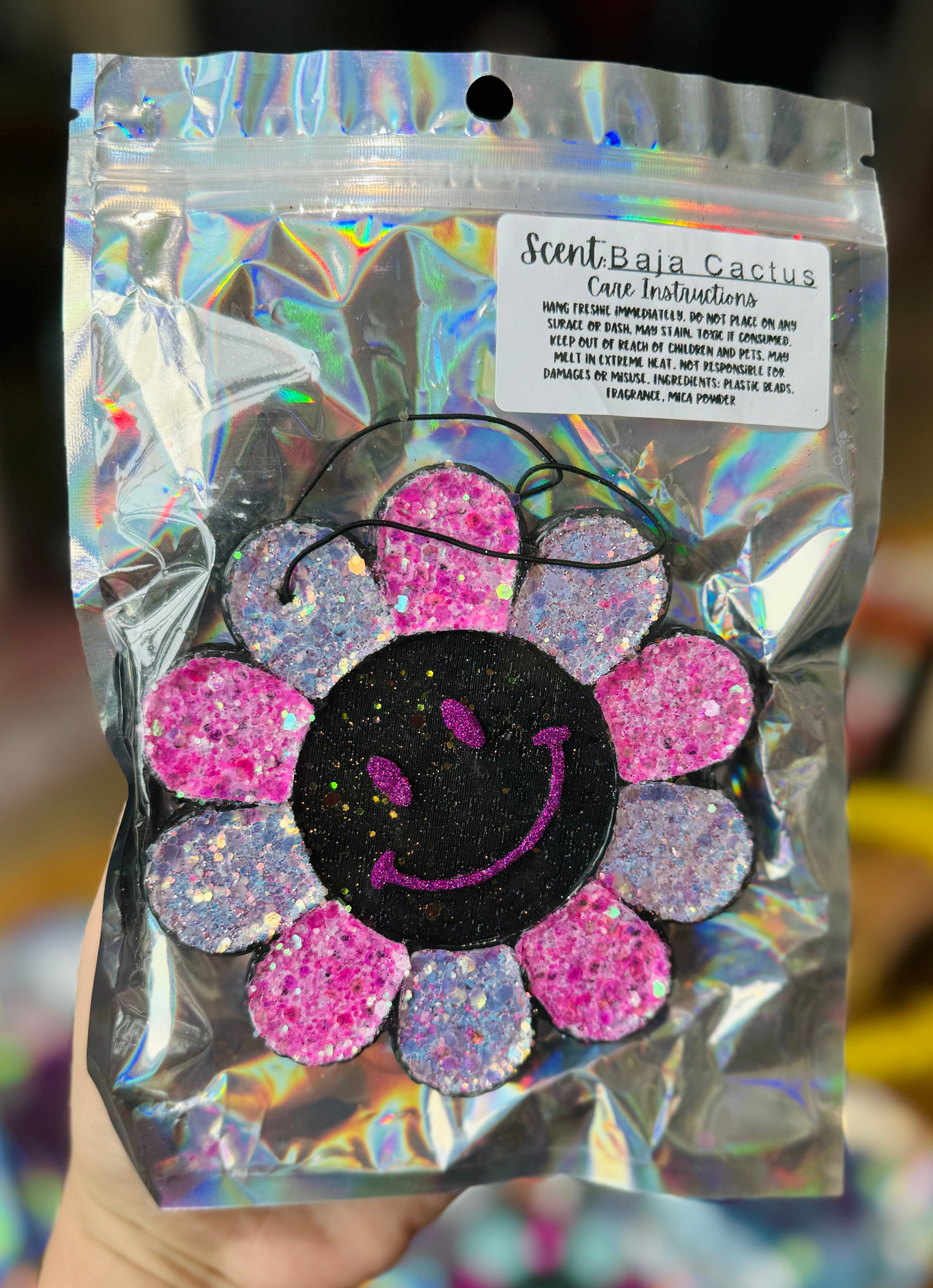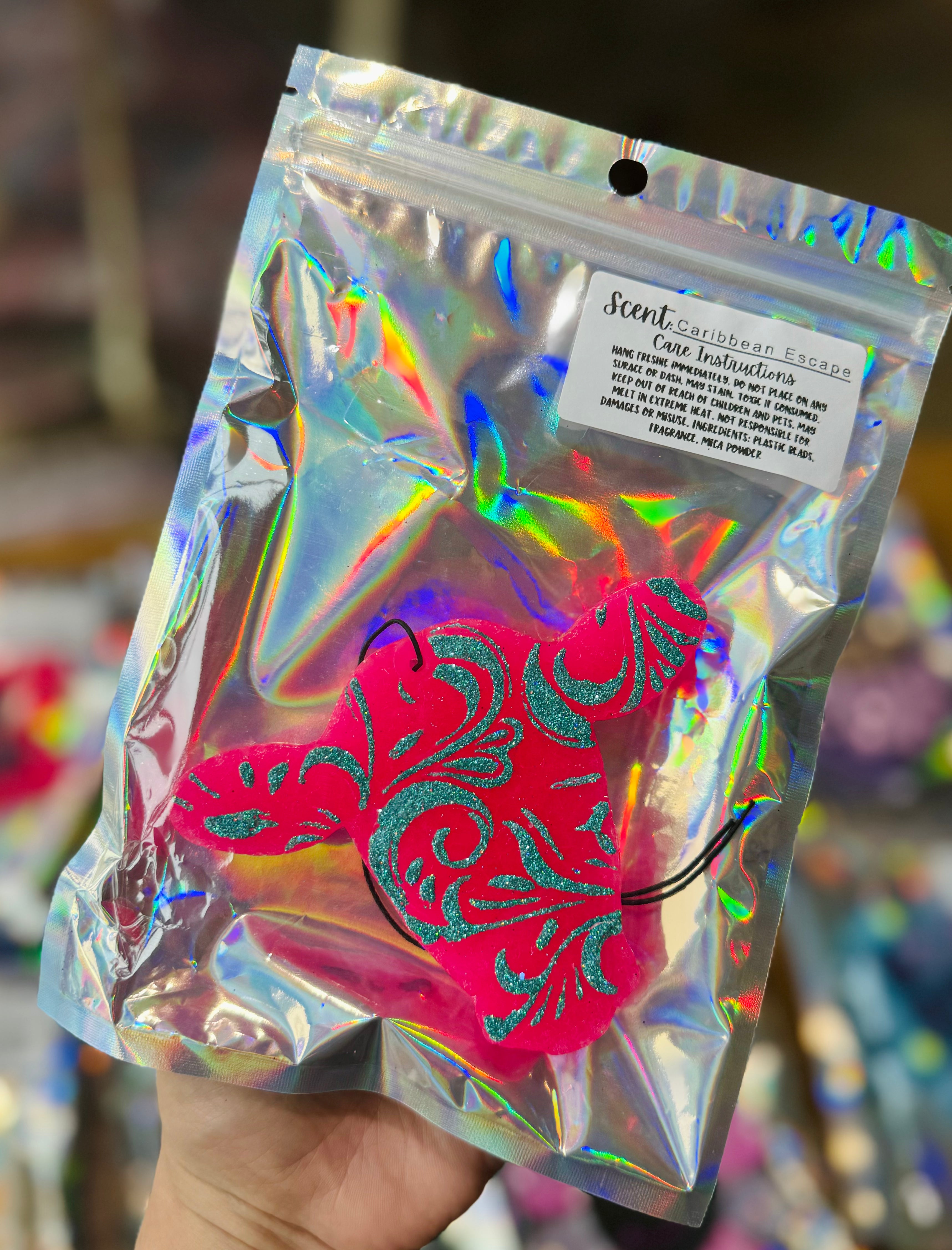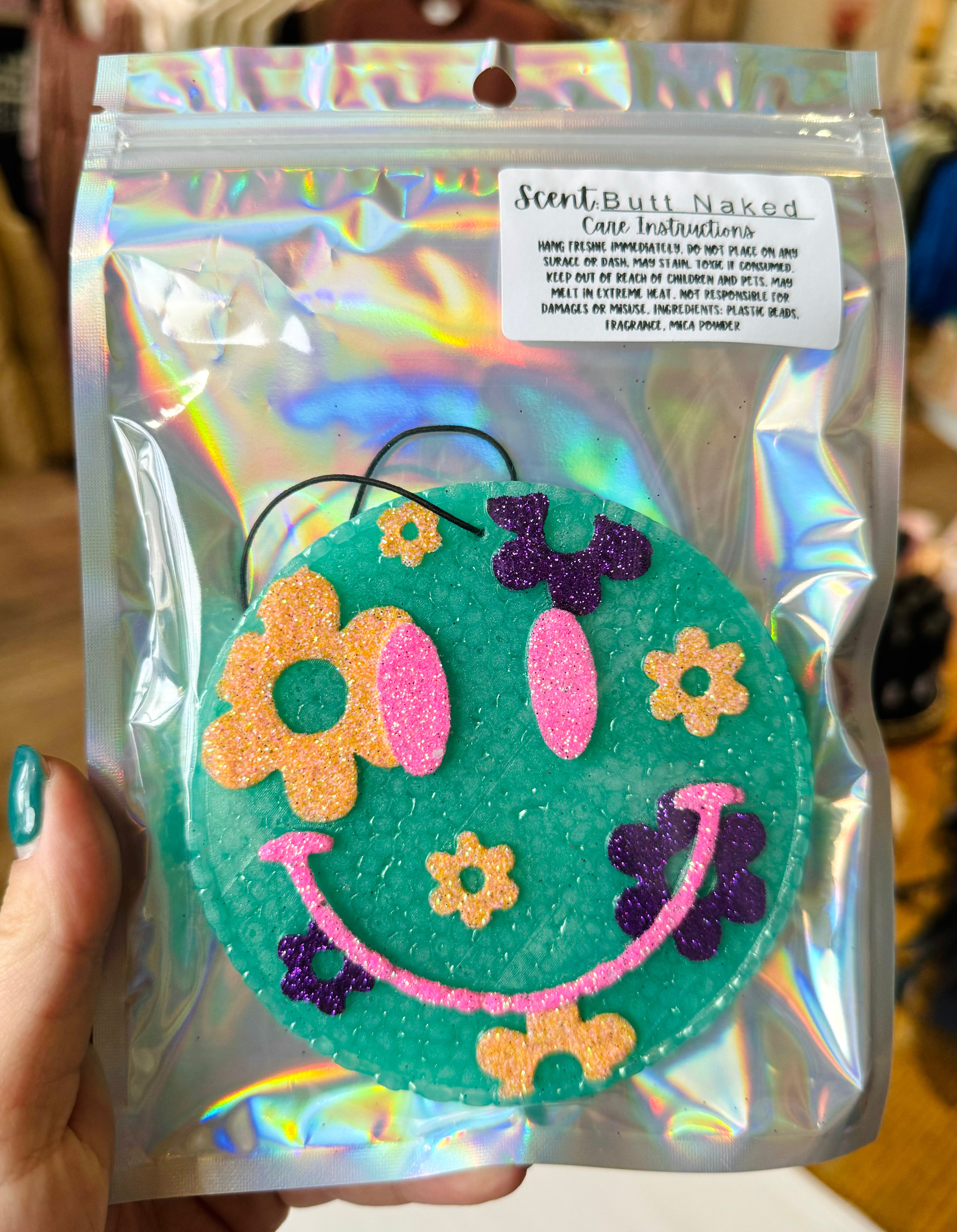 Car Air Freshener, Hung on elastic string and packaged in holographic silver smell proof bag providing long shelf life. COLORS and SCENTS will VARY from shown and design will be shipped in variety/random colors or scents (when applicable, seasonally appropriate). Scent on average lasts 3-5 weeks. Average size 4"-5"