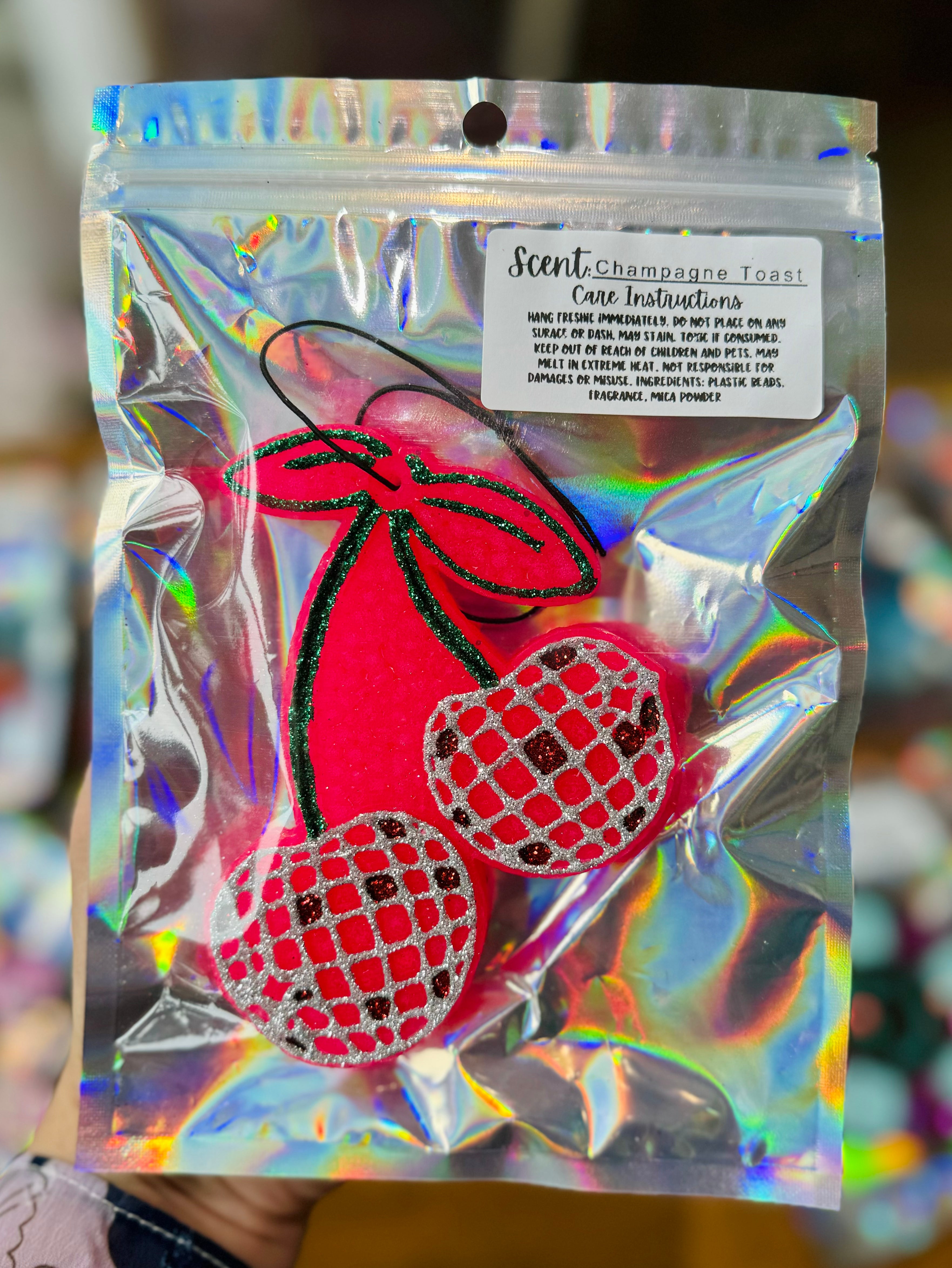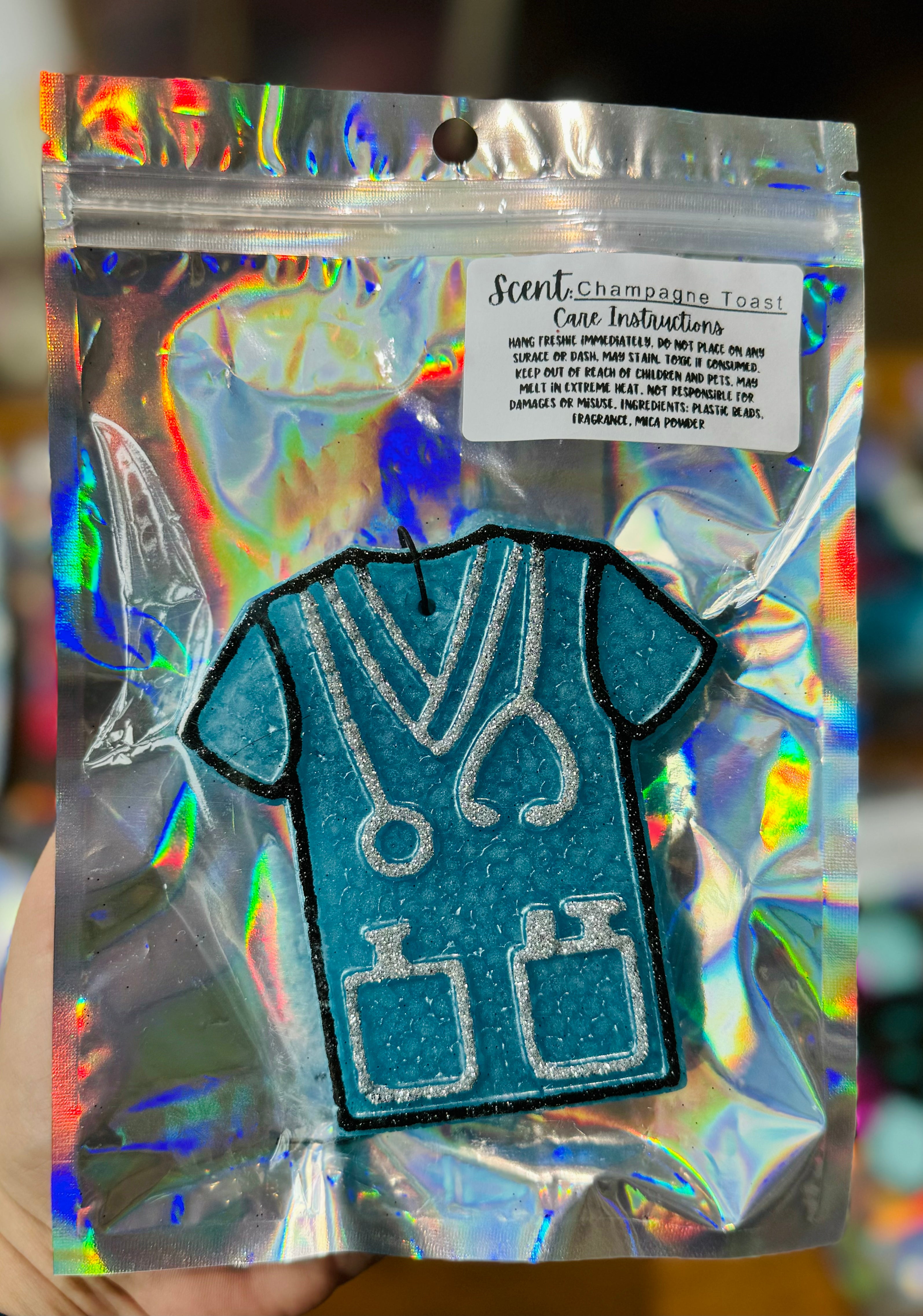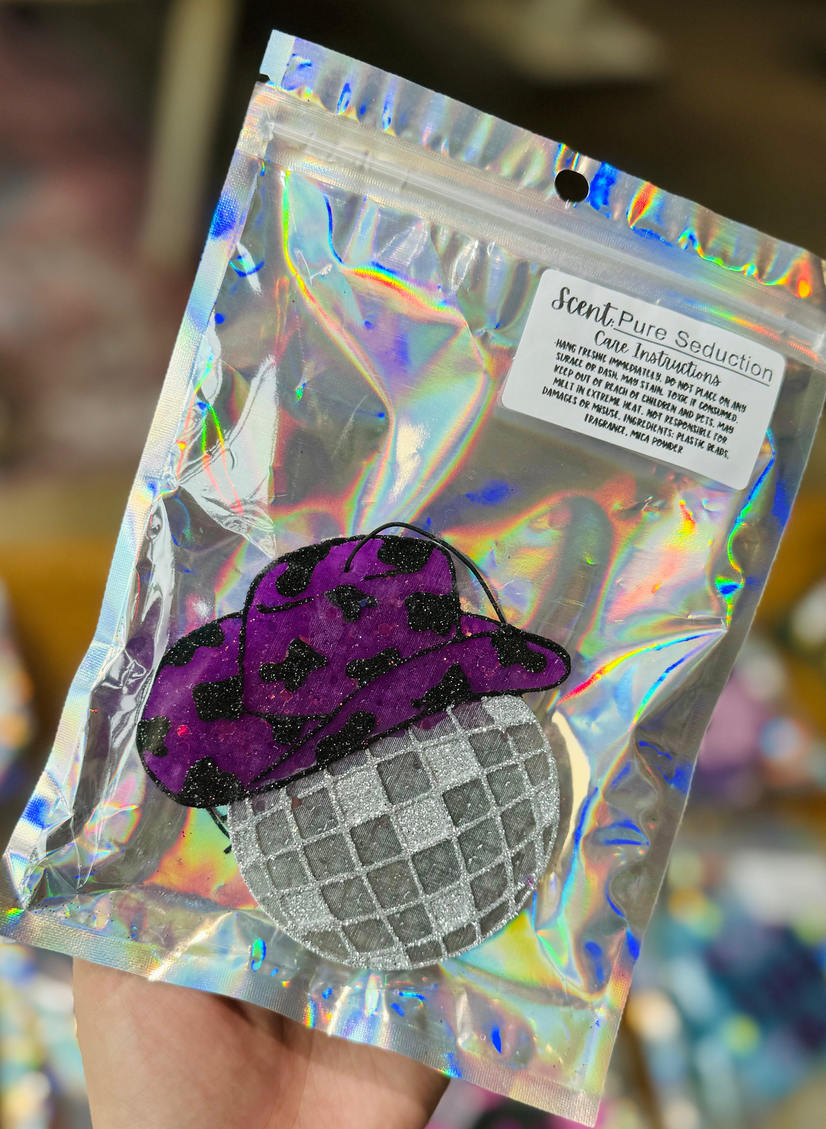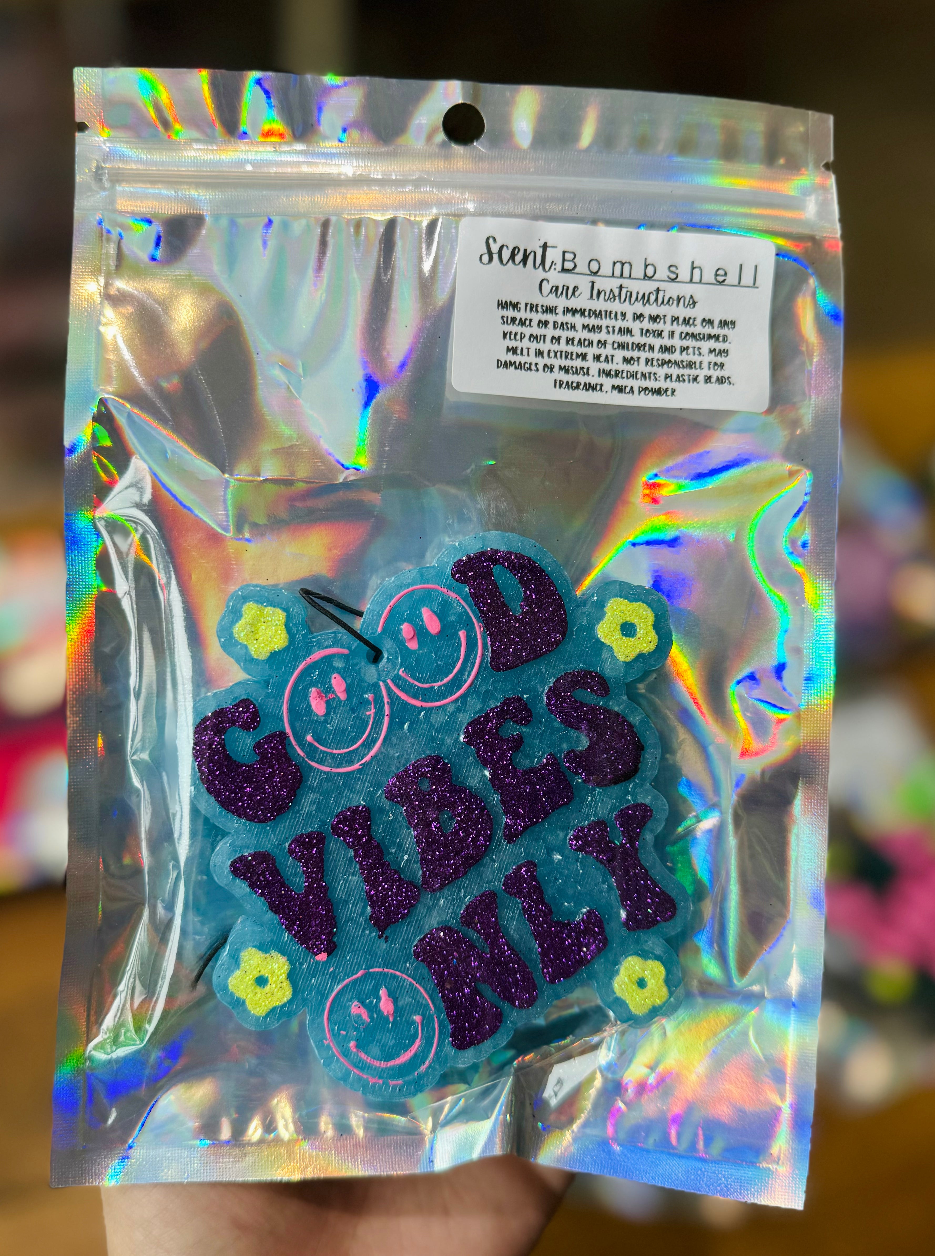 Car Air Freshener, Hung on elastic string and packaged in holographic silver smell proof bag providing long shelf life. COLORS and SCENTS will VARY from shown and design will be shipped in variety/random colors or scents (when applicable, seasonally appropriate). Scent on average lasts 3-5 weeks. Average size 4"-5"