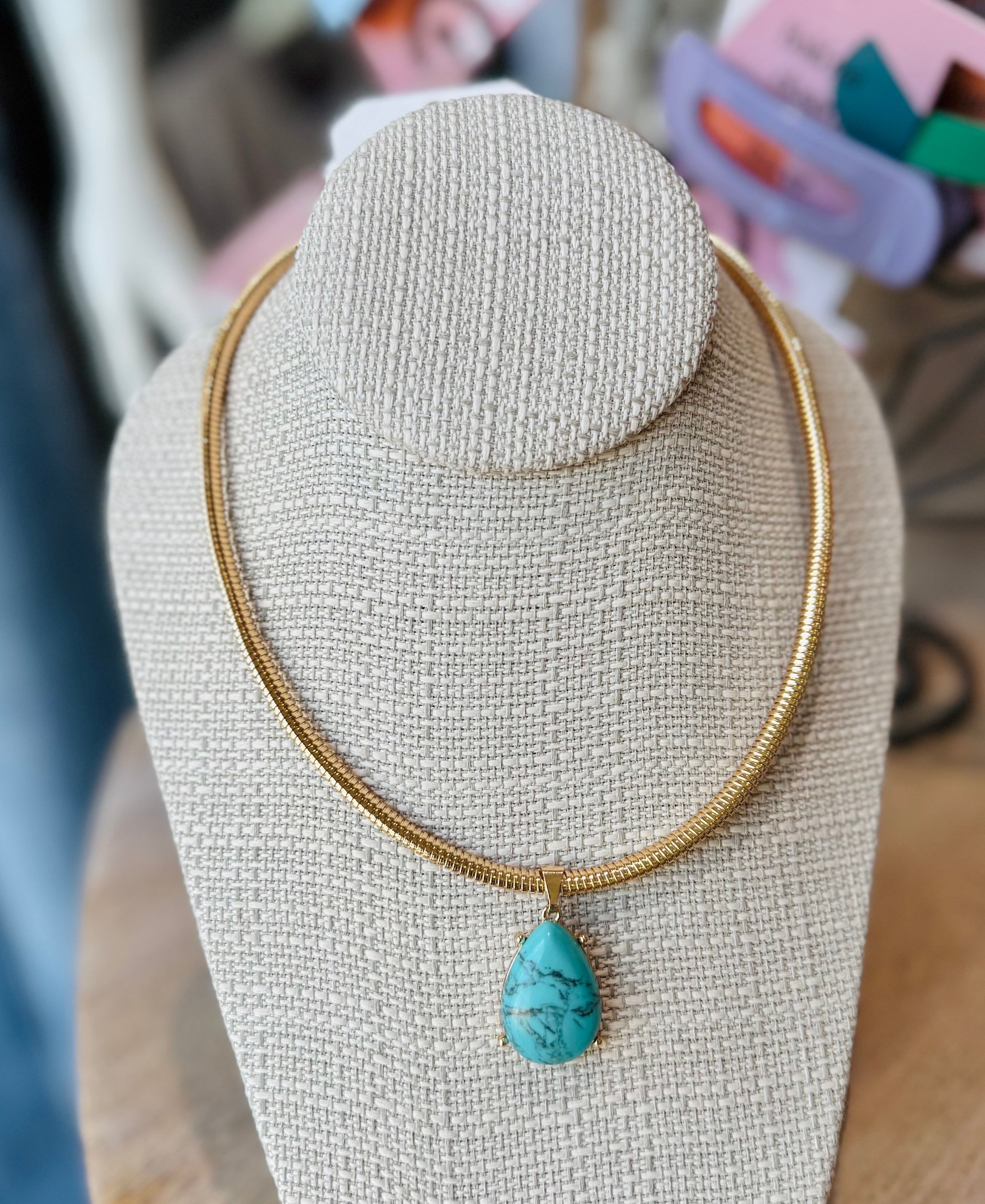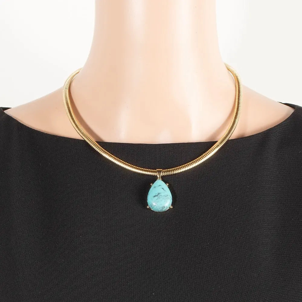 Add a captivating touch to your wardrobe with the Turquoise Pendant Chain Necklace. This elegant piece features a teardrop-shaped turquoise pendant suspended from a sleek, flexible metallic snake chain that gracefully drapes around your neck. Designed for comfort and style, it effortlessly enhances both casual and formal looks with a pop of vibrant color and refined texture.