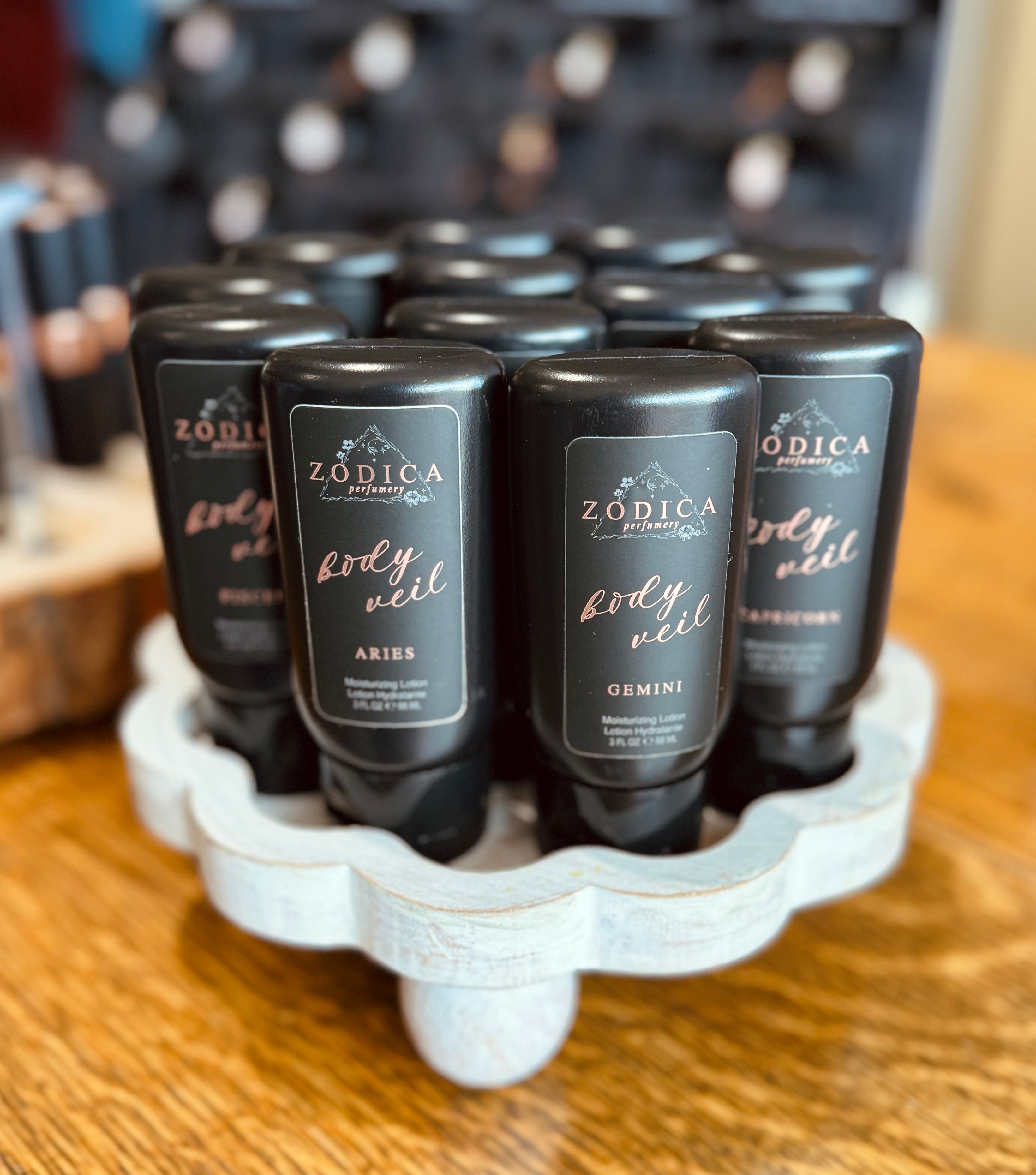 Zodica Perfumery Body Veil Lotion leaves skin silky smooth with a barely-there finish. Includes Organic Aloe Vera, Vitamins (A,D,E), Sweet Almond Oil. Paraben Free, Sulfate Free, Cruelty Free. 100% Vegan. Small-Batched. Made in the U.S.A. 3oz Travel Size.
