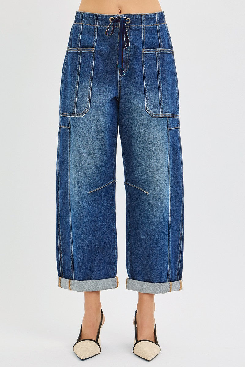 Meet your new favorite denim with an edge — the Risen Barrel Wide Cargo Cuffed Jeans in a rich dark wash. These jeans feature a comfortable elastic waistband with a tie front and zip fly, blending structure with laid-back ease. The cargo-style pockets add a trendy utilitarian touch, while the wide barrel leg gives them that effortless, modern shape. Designed with stretch denim for all-day comfort, these jeans can be worn cuffed for a cropped look or uncuffed for extra length.