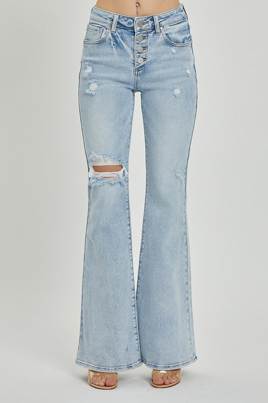 Step into vintage-inspired style with our Risen Mid Rise Button Down Flare Jeans. These light wash flares feature a flattering mid-rise fit with a five-button fly closure and a classic distressed knee for that effortlessly lived-in look. The 33” inseam and soft stretch denim make them perfect for elongating your legs while keeping you comfortable all day long. Designed with a subtle flare and gentle fading throughout, these jeans pair beautifully with everything from fitted tanks to chunky sweaters.