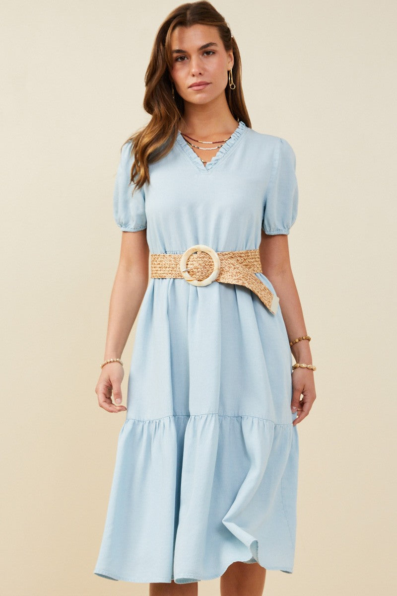 Elevate your wardrobe with this Chambray Puff Sleeve Midi Dress crafted from soft, washed Tencel fabric for breathable comfort. Its flattering V-neckline and delicate ruffled tiers create a feminine silhouette, while puff sleeves add a touch of playful elegance. Perfect for day-to-night wear, this dress combines style and ease effortlessly.
