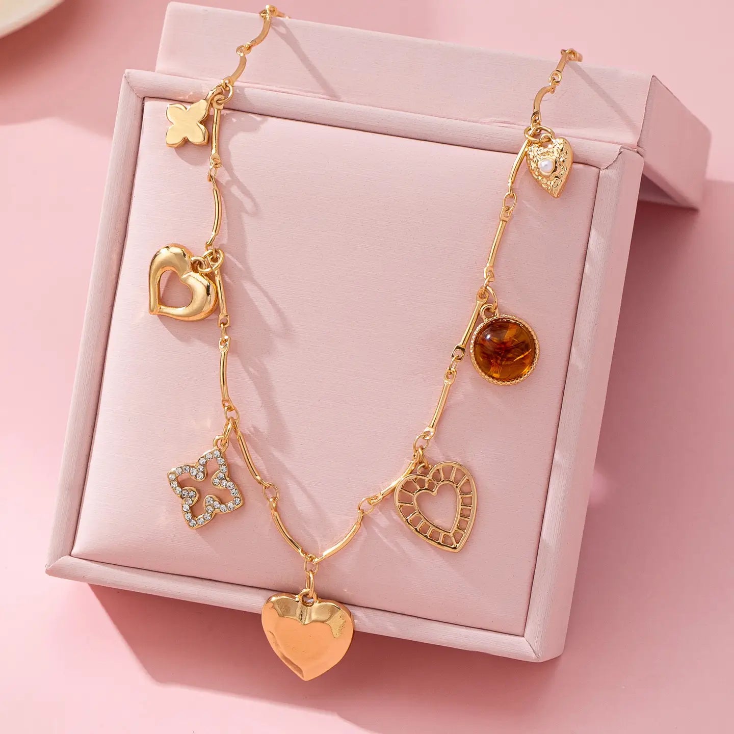 - Charms: 6 delicate charms (small clover, open heart, pearl-embellished heart, amber gem, puffed heart, lattice heart)