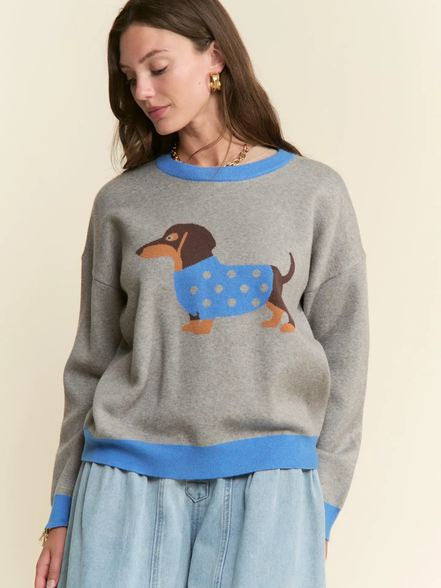 • Charming dachshund graphic with a blue polka-dot sweater