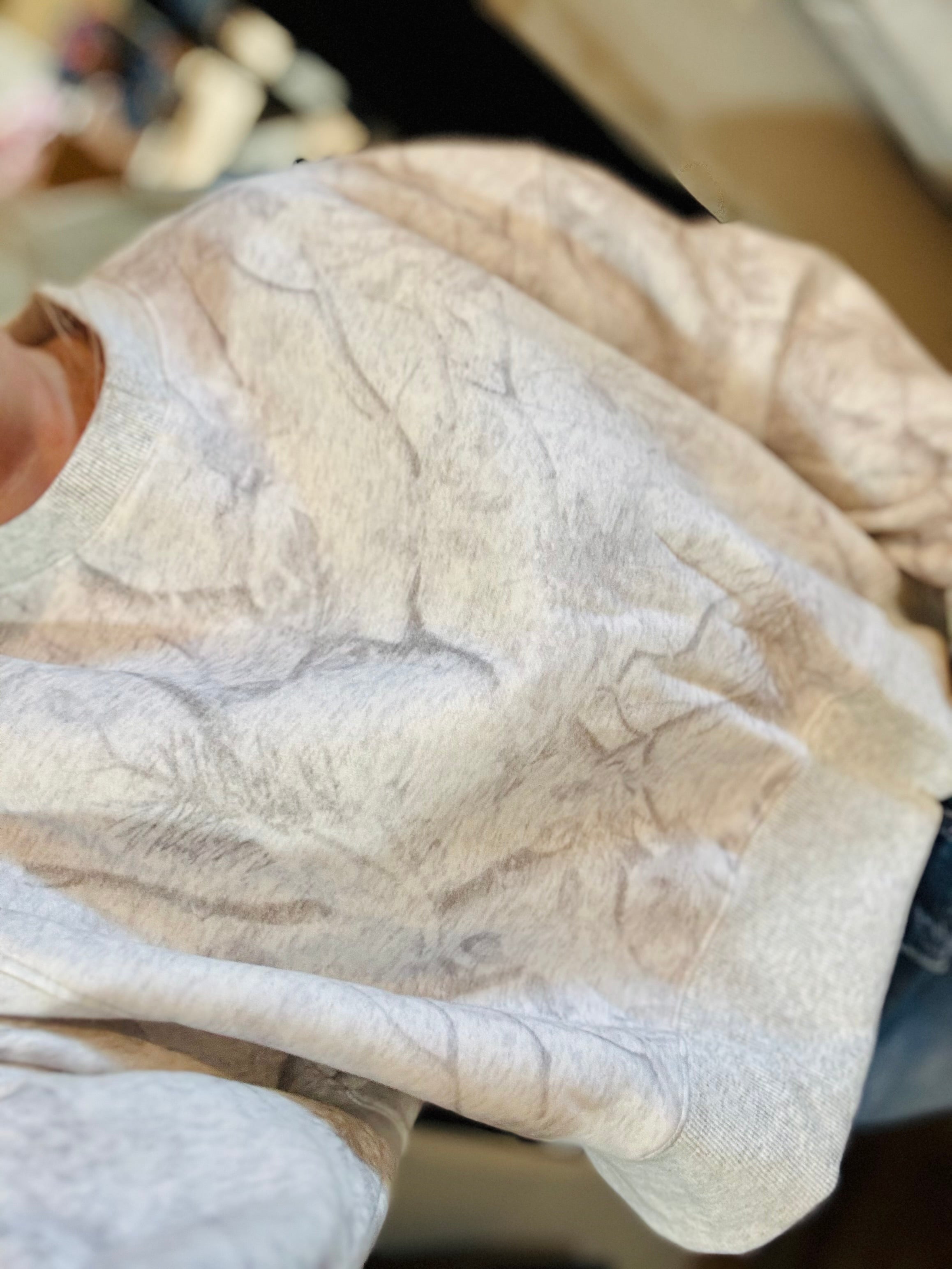Stay warm in style this season with our light grey camo sweatshirt — the perfect mix of comfort and cool. Designed with a boxy, oversized fit, this sweatshirt offers that effortlessly relaxed look you love. The soft fleece lining keeps you extra cozy on chilly days, while the cropped length pairs perfectly with high-waisted jeans or leggings. Subtle neutral camo tones add just the right amount of edge without overpowering your outfit.