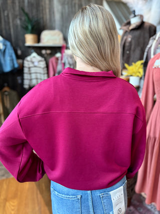 Back view of the woman wearing a light pink sweatshirt showing there is no writing on the back of the sweatshirt.