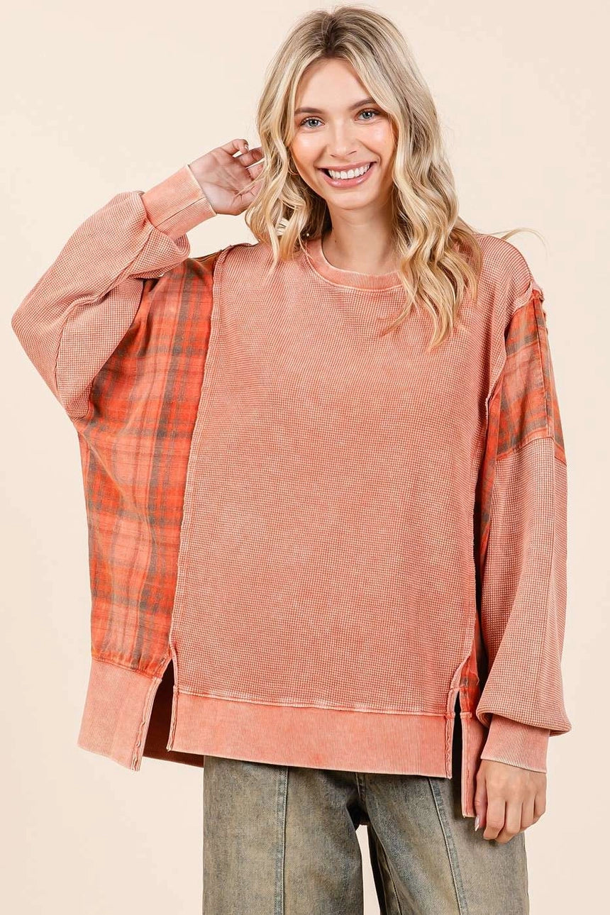 Stay cozy and stylish in this playful oversized sweatshirt featuring a unique blend of plaid woven fabric and soft cotton French terry. The mineral wash adds a vintage touch, while raw-edge seams and a ribbed band hem with side slits bring an unexpected edge. With long sleeves, banded cuffs, and a comfy round neck, it’s perfect for layering or lounging!