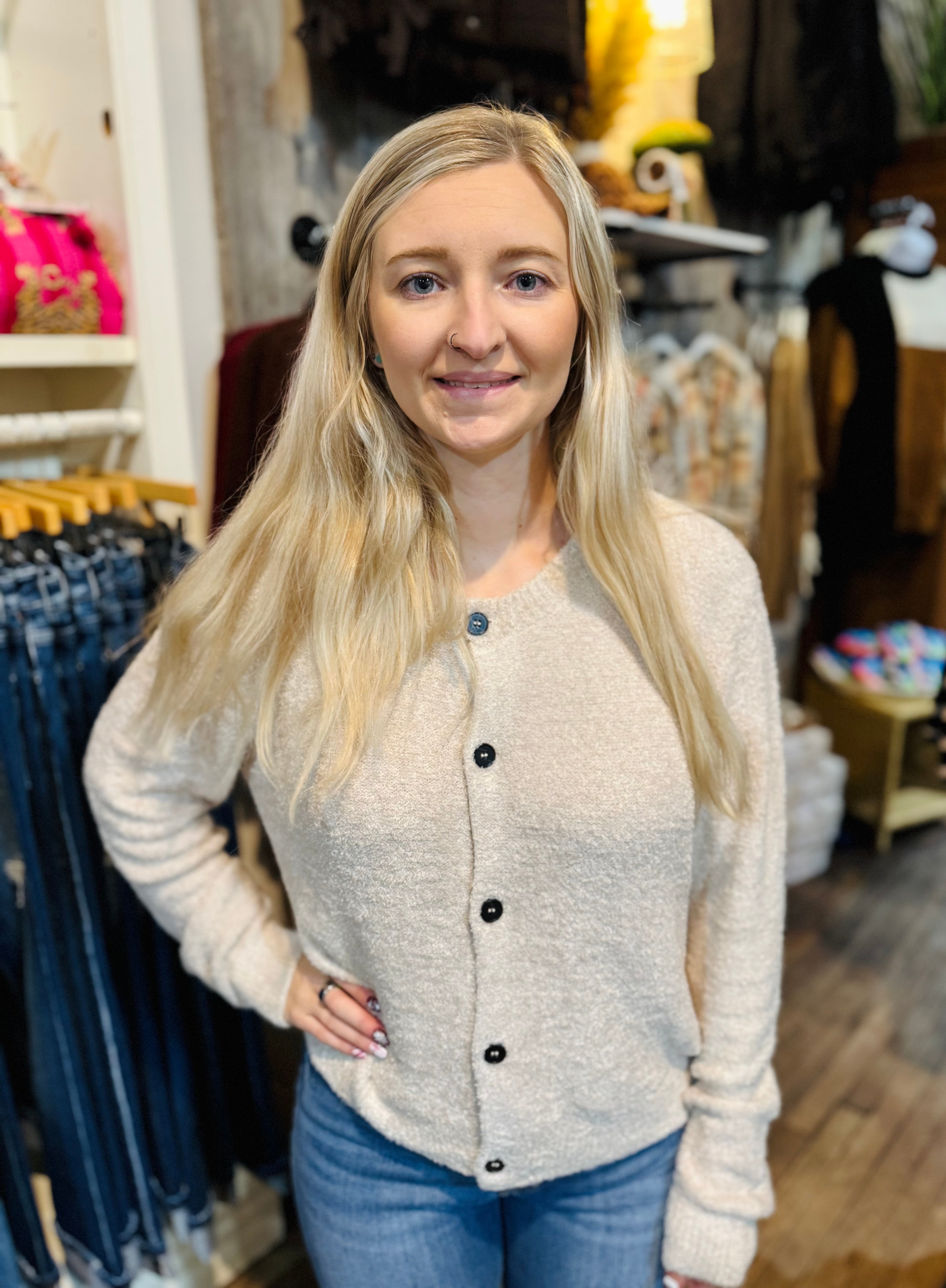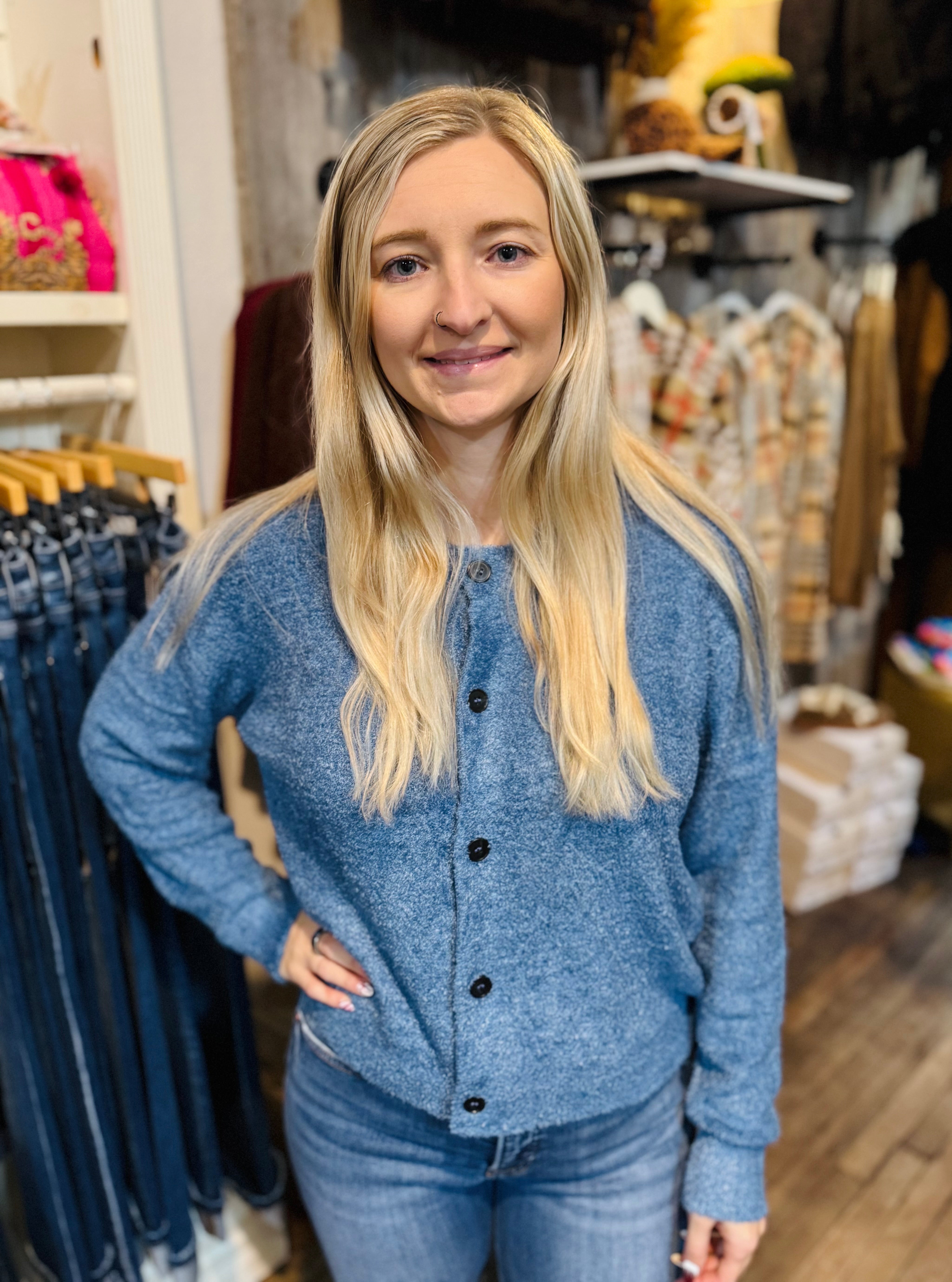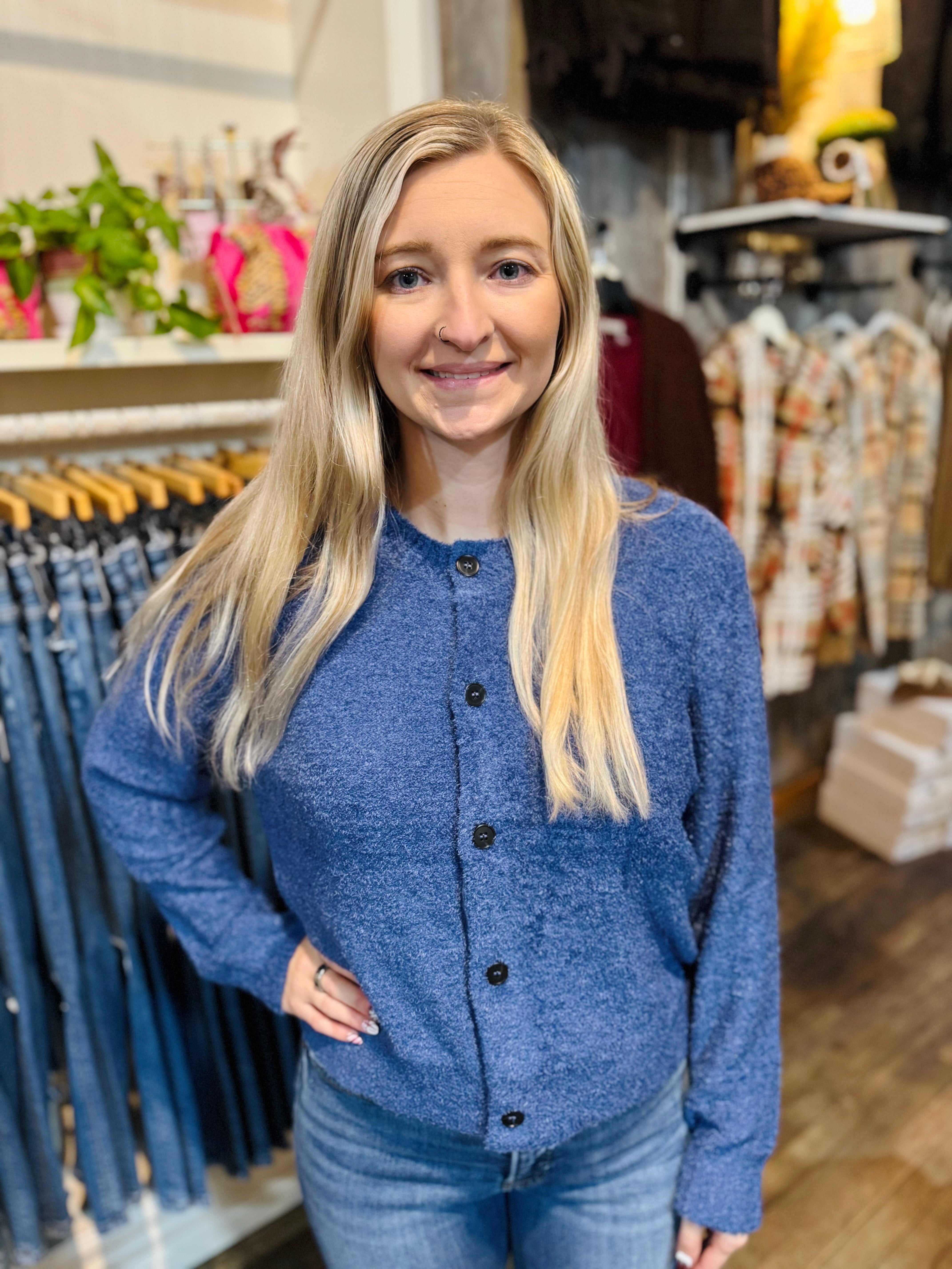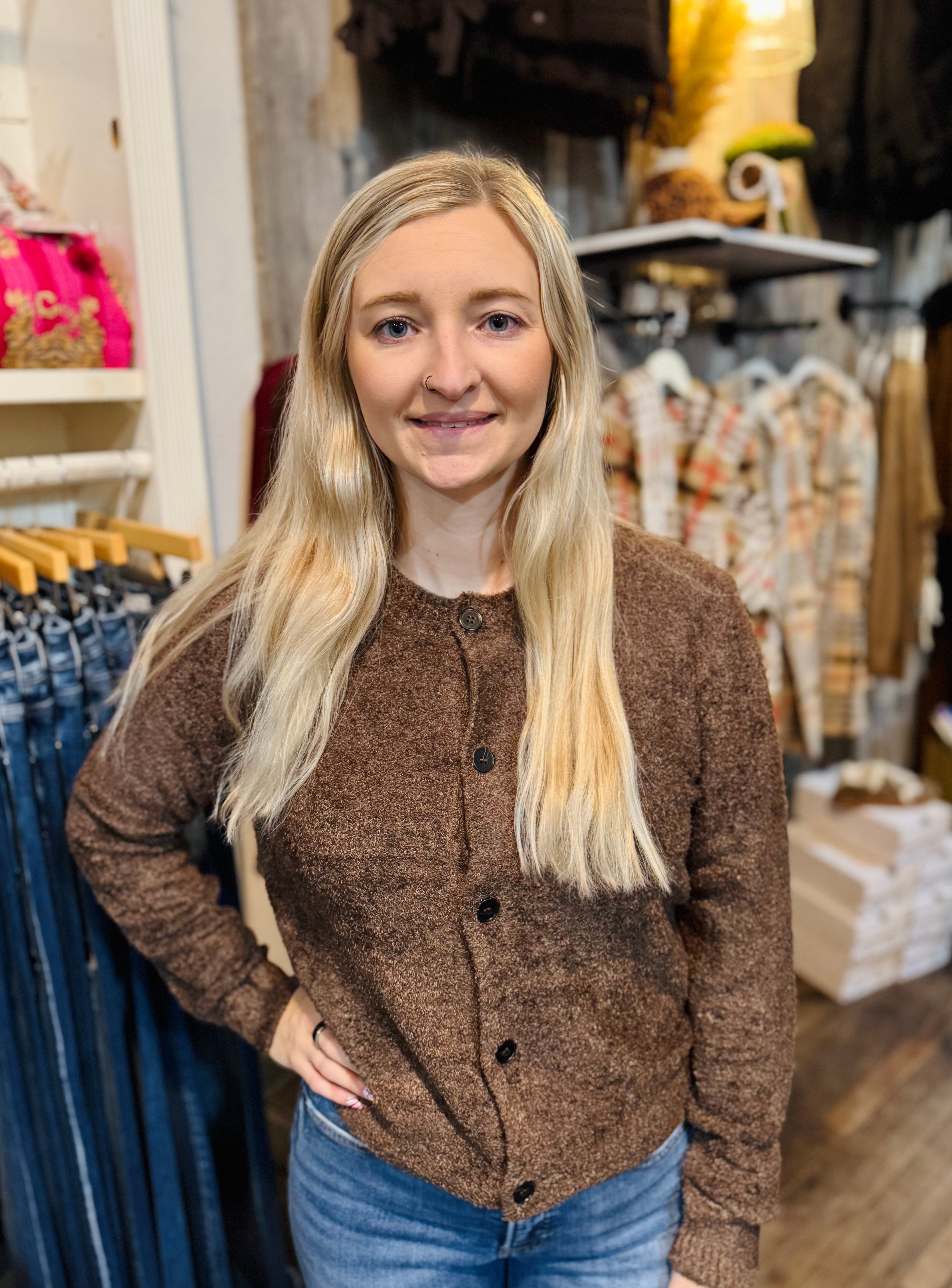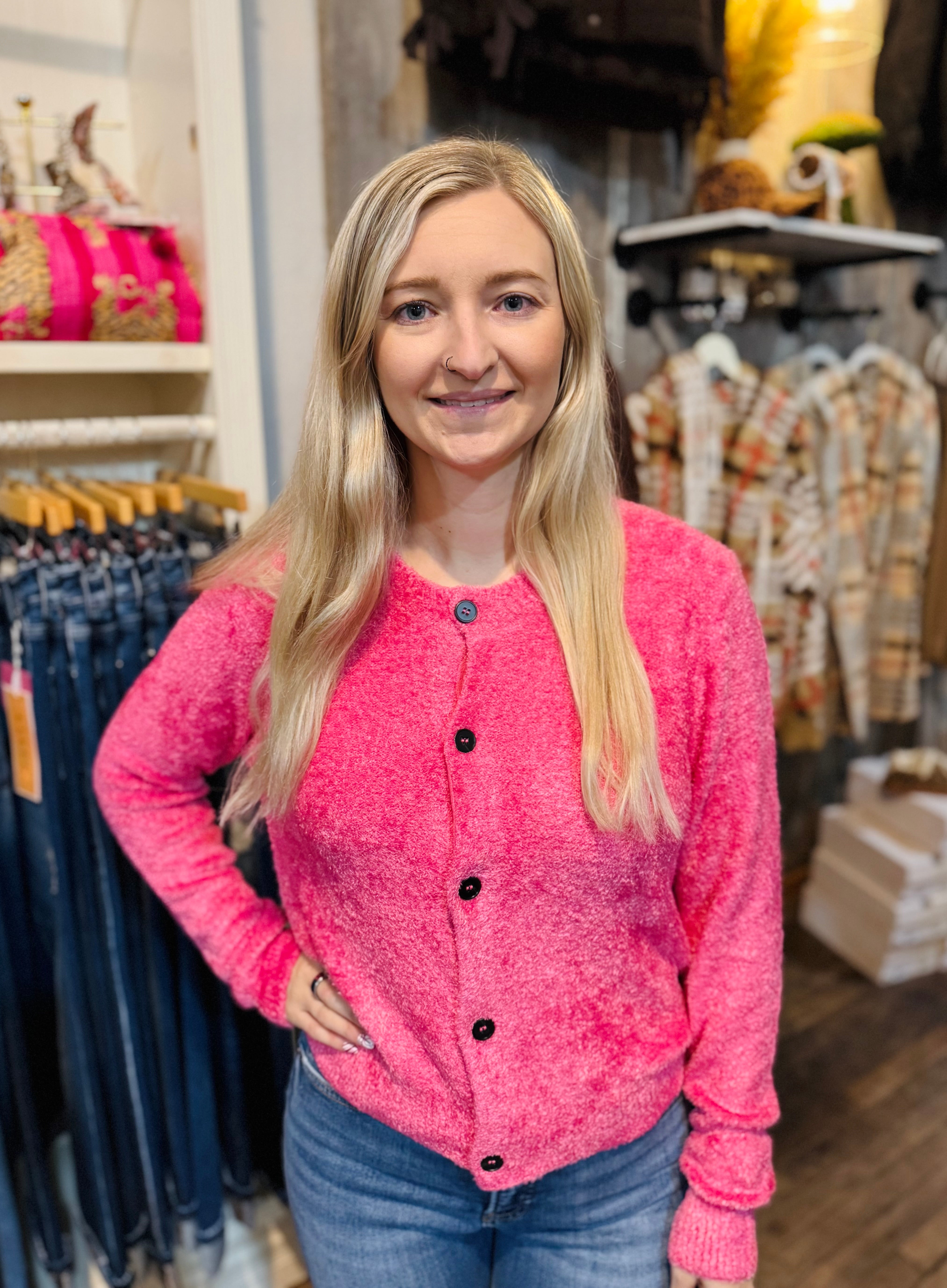 Meet your new favorite layer—a dreamy cardigan that feels as good as it looks. This super-soft chenille beauty features a touchable, hairy texture that's pure comfort. Five buttons, long sleeves, and a medium length create an easy, versatile silhouette, while the rounded high neckline keeps things chic and cozy!
